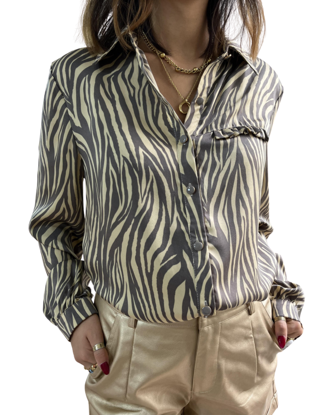 Entdecke die Bluse mit Zebradruck, ein Must-Have-Stück, das Modernität und Charakter vereint. Der Zebradruck sorgt für einen wilden und eleganten Touch, perfekt für alle, die einen mutigen Stil zeigen möchten. Seine schmale Passform und die makellose Verarbeitung machen es zur idealen Wahl für alle Gelegenheiten, egal ob für einen professionellen oder lässigen Look.