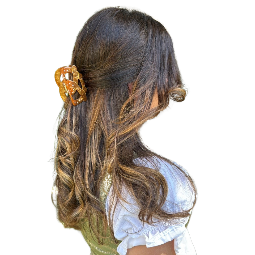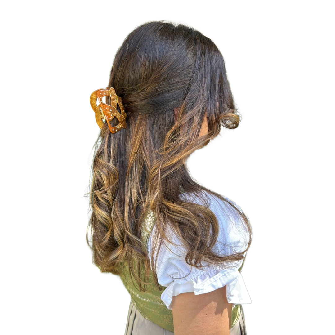 Die Volksfeste starten und die Dirndl sind bereit - mit unserer neuen Brezen Haarklammer/ Haarspange kannst du nun auch deine Haare stilvoll bändigen. Unsere Haarklammer in Form einer Brezel ist ein traditionelles und zugleich modernes Accessoire, das perfekt zu deinem Dirndl oder deinem Oktoberfest-Outfit passt. Hergestellt aus hochwertigem Celluloseacetat und verziert mit filigranen Details, ist diese Haarklammer nicht nur praktisch, sondern auch ein echter Hingucker. Egal ob du deine Haare zum Zopf binden möchtest oder ihnen einfach einen verspielten Akzent verleihen willst, unsere Brezen Haarklammer ist das perfekte Accessoire für stilvolle Frauen. Hol dir jetzt das angesagte Oktoberfest-Must-Have und vervollständige deinen Look mit unserer einzigartigen Brezen Haarklammer.