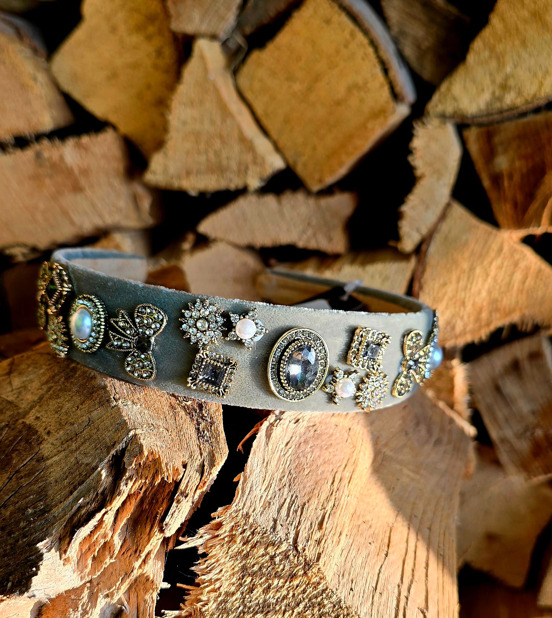Luxuriöser Haarreifen mit funkelnden Schmucksteinen Samt Khaki