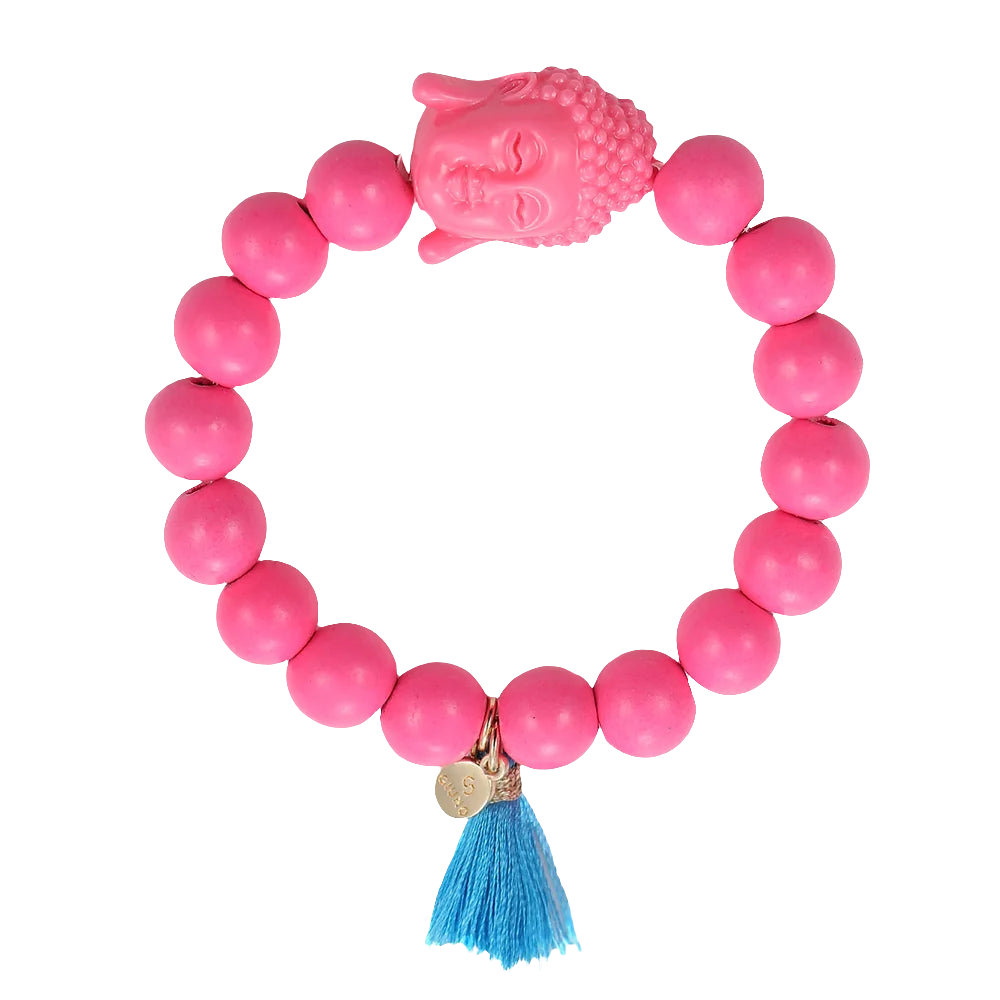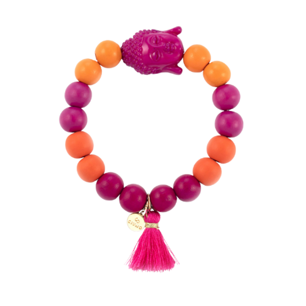 Holzperlen Armband auf Elastikbank mit Holzperlen 12 mm, Buddha und Quaste.