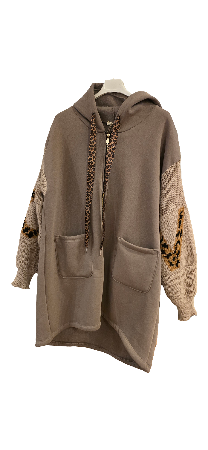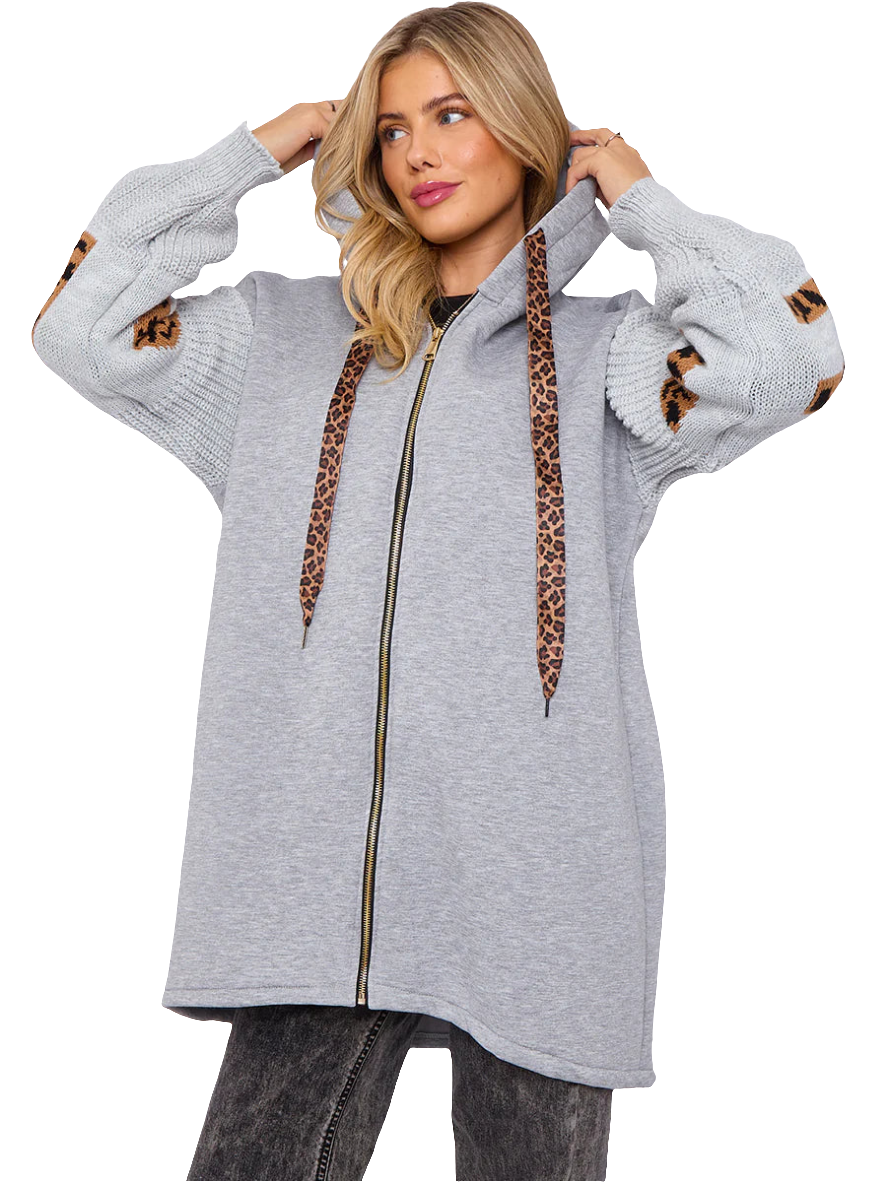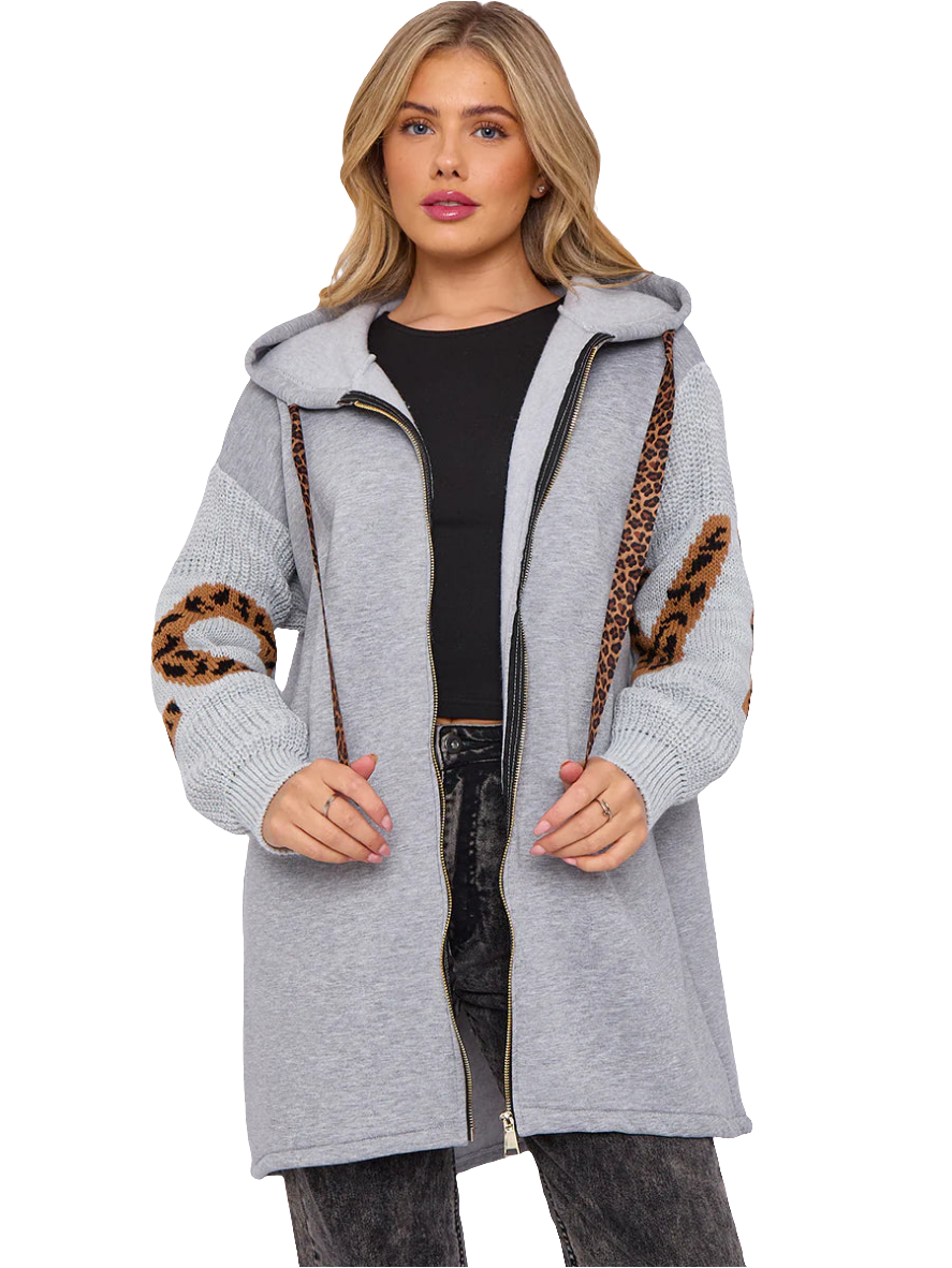Love – Mantel mit gestrickten Ärmel mit Love-Print Funktionelle Kordelzüge im Leo Print Reißverschluss Leicht Oversize - Passt bis Gr. 44
