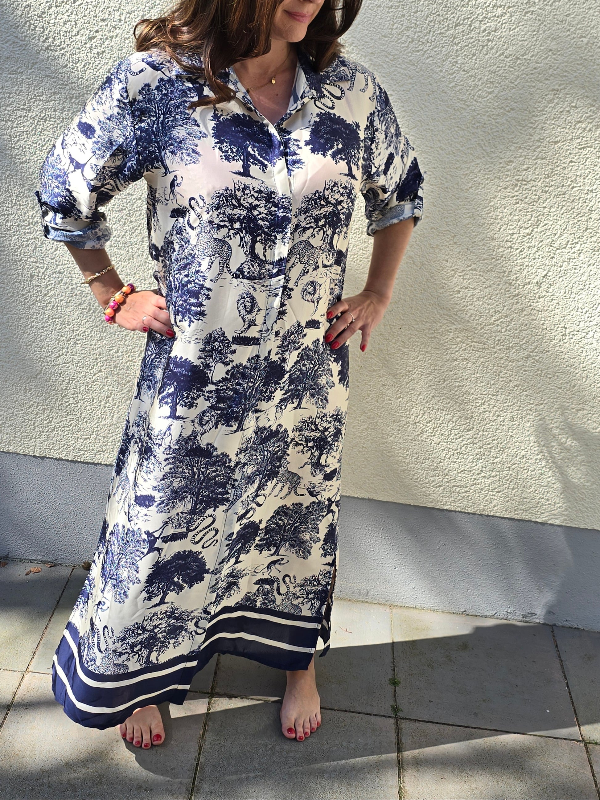 Dieses stilvolle Maxikleid mit klassischem Toile de Jouy Print in Blau-Weiß ist ein echtes Highlight für jede Garderobe. Der hochwertige Stoff fällt fließend und sorgt für ein angenehmes Tragegefühl – perfekt für warme Tage oder besondere Anlässe. Mit seinen exotischen Tiermotiven, eleganten Bäumen und feinen Details zieht dieses Kleid garantiert alle Blicke auf sich. Die seitlichen Schlitze und der lockere Schnitt verleihen dem Design eine moderne Note.
