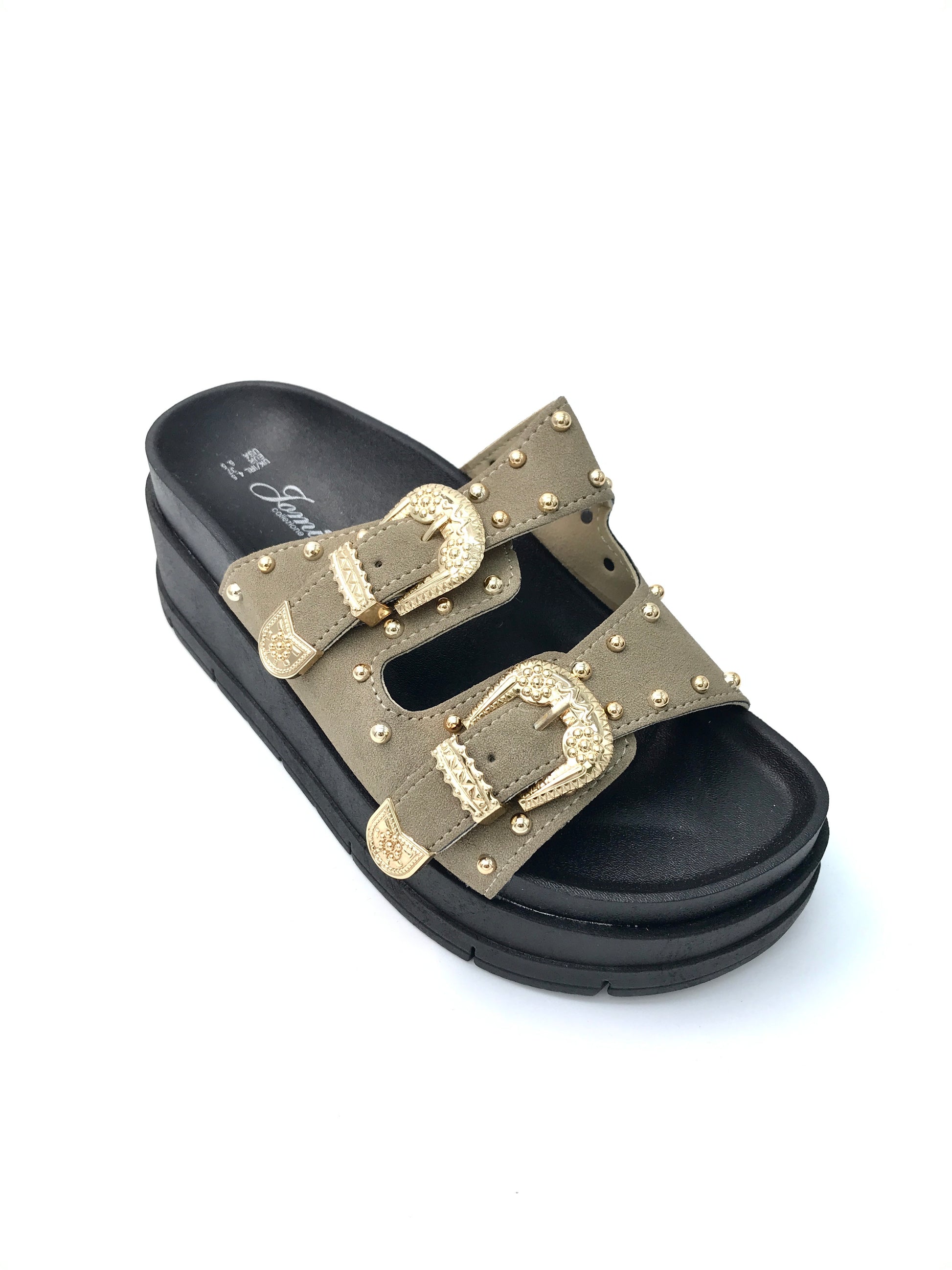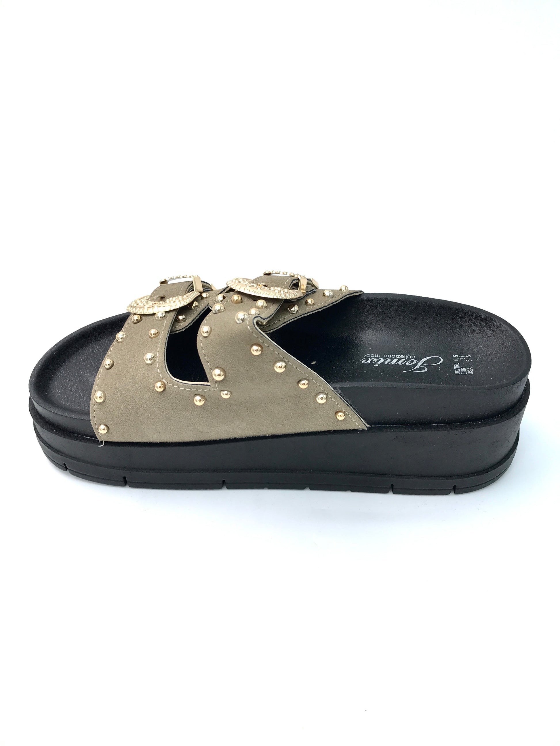 Trendige Plateau-Sandale mit goldenen Schnallen und Nieten – stylisch & bequem