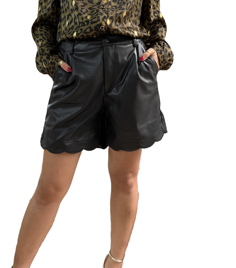 Entdecke unsere Kunstleder-Shorts, ein elegantes und modernes Kleidungsstück, das Deinem Outfit einen Hauch von Raffinesse verleiht. Der taillierter Schnitt betont die Silhouette, während die wellenförmigen Details am unteren Rand für eine originelle und schicke Note sorgen. Diese Shorts eignen sich ideal für einen modernen und raffinierten Look und sind perfekt für alle, die mit Eleganz auffallen möchten.