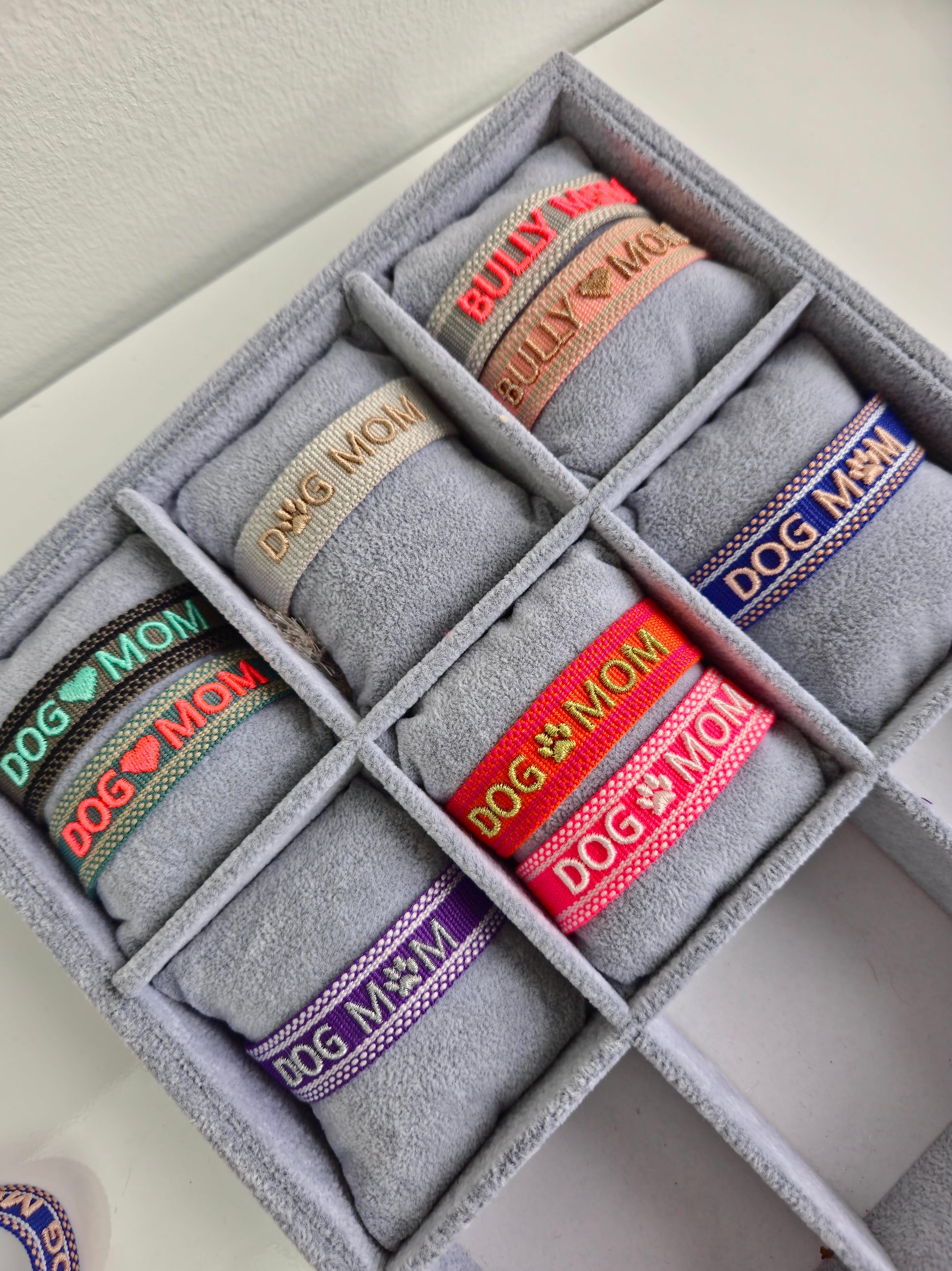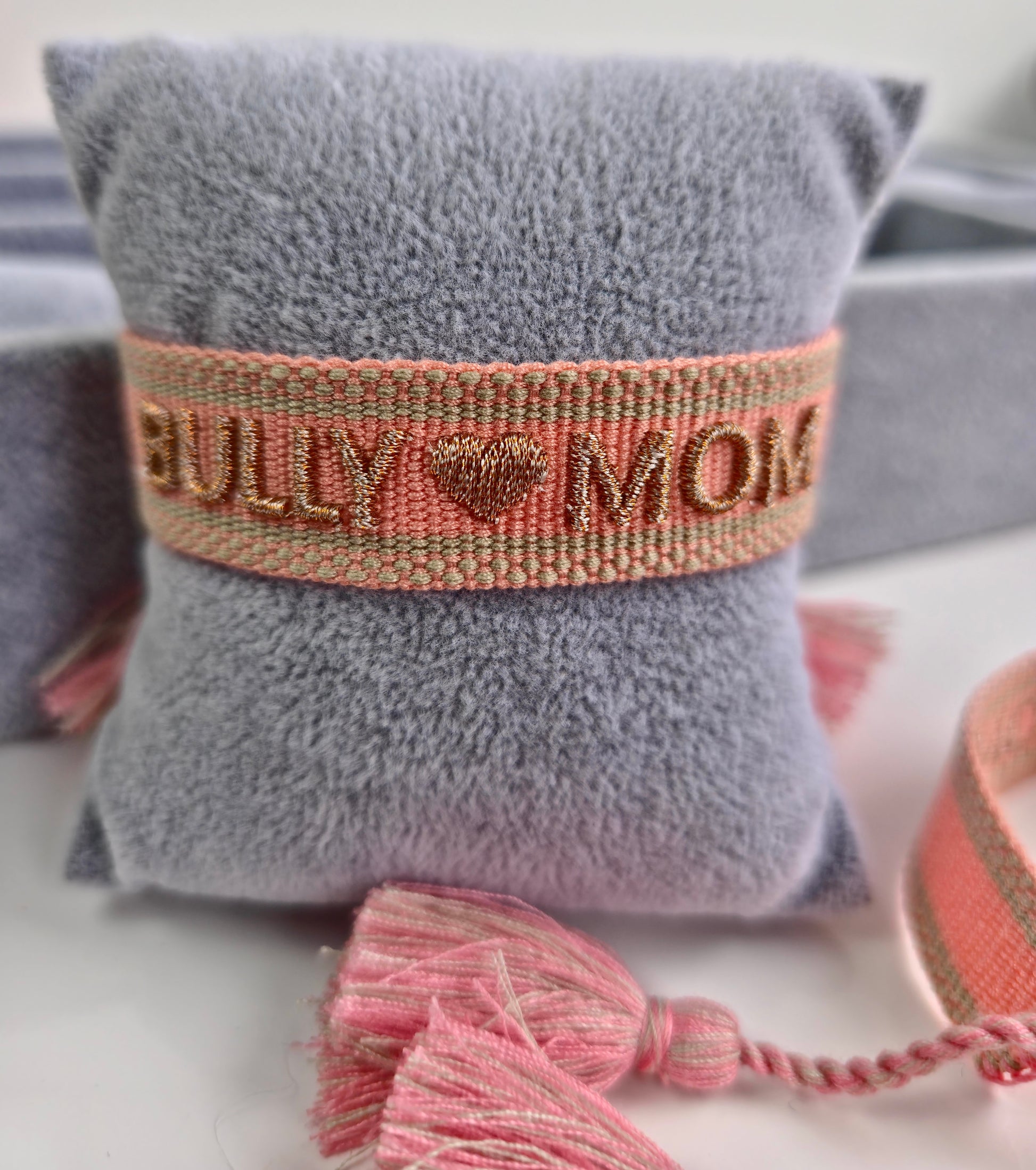 Zeig deine Liebe zu deiner Bulldogge – mit diesem handgewebten Armband im angesagten Boho-Stil! Der Schriftzug „BULLY ♥ MOM“ ist in glänzendem Goldstickgarn auf zartem Rosa gearbeitet und macht das Armband zu einem stilvollen Statement für alle Bully-Mamas.