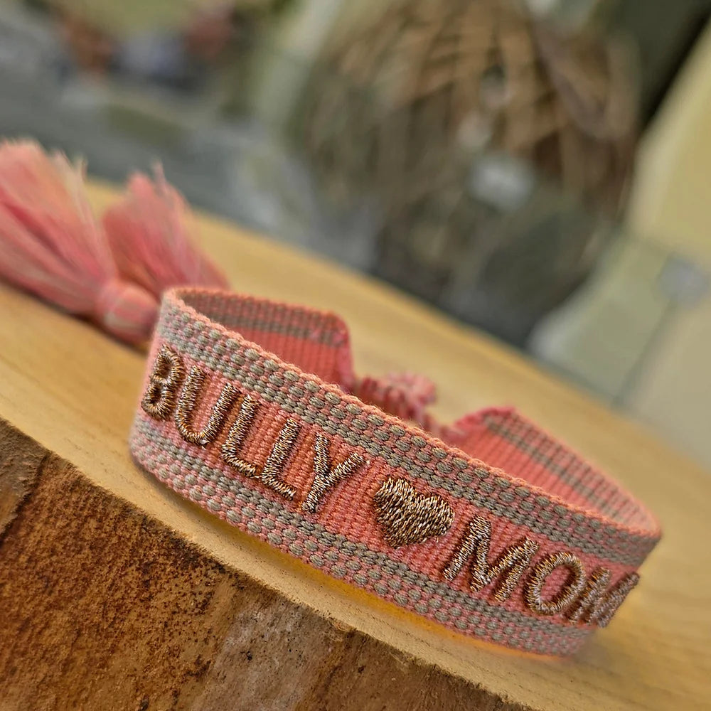 Handgewebtes Armband „BULLY MOM“ – Rosa & Gold | Statement-Schmuck für Hundemamas