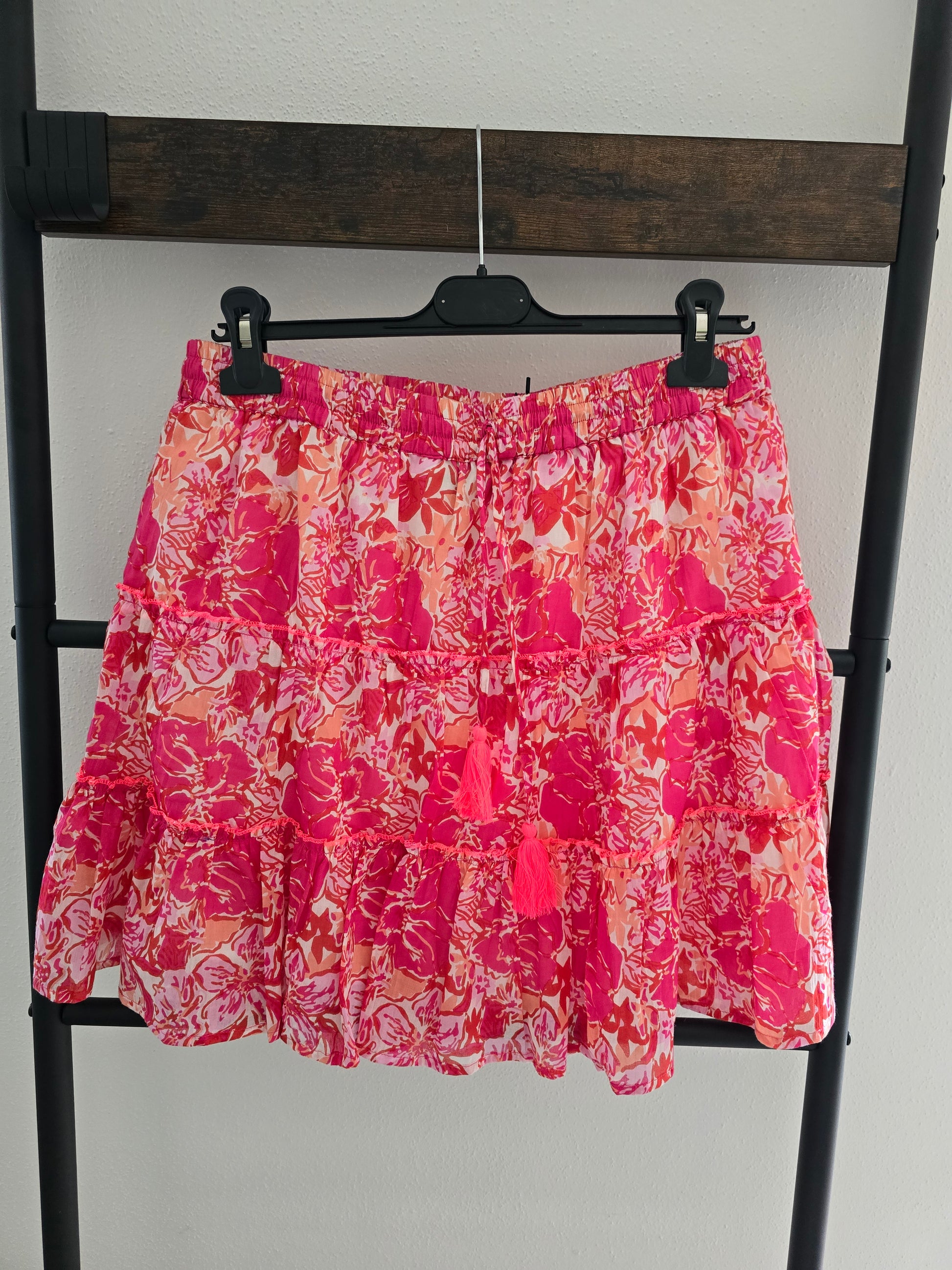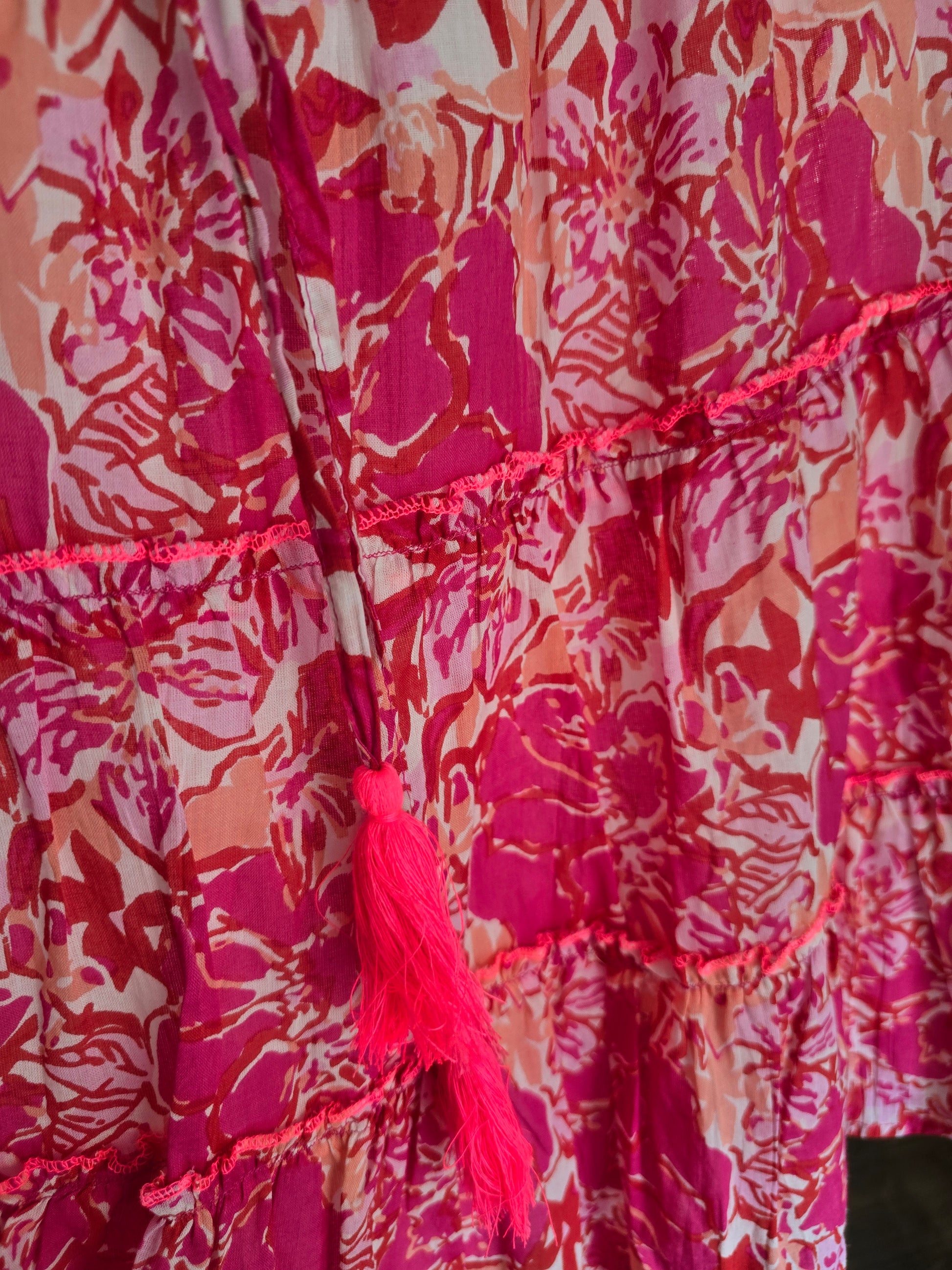 - 🌸 Farbenfroher Blumenprint in leuchtendem Pink und warmem Korallton – perfekt für Sommer, Strand & Urlaub